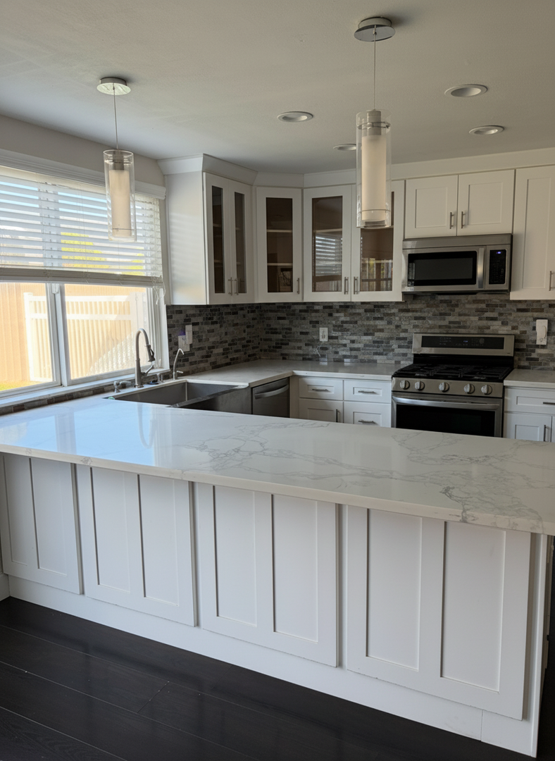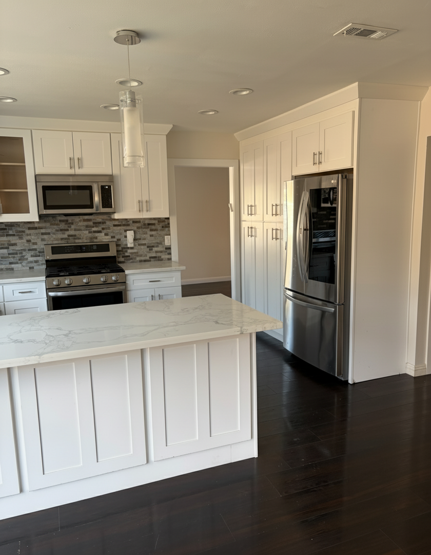 The kitchen opens to a comfortable family room with a breakfast counter for casual dining and recessed lighting throughout. Durable dark wood laminate flooring adds warmth and is easy to maintain.