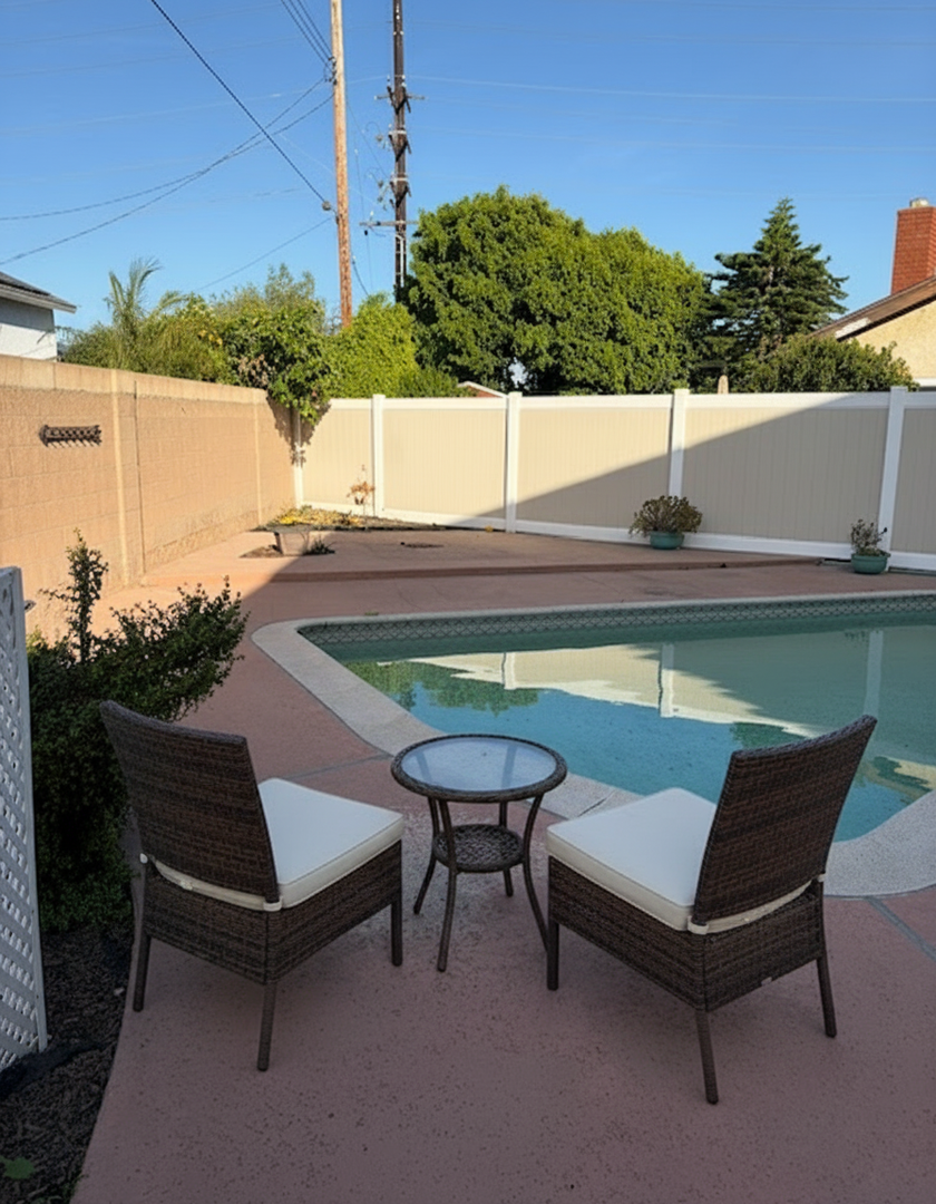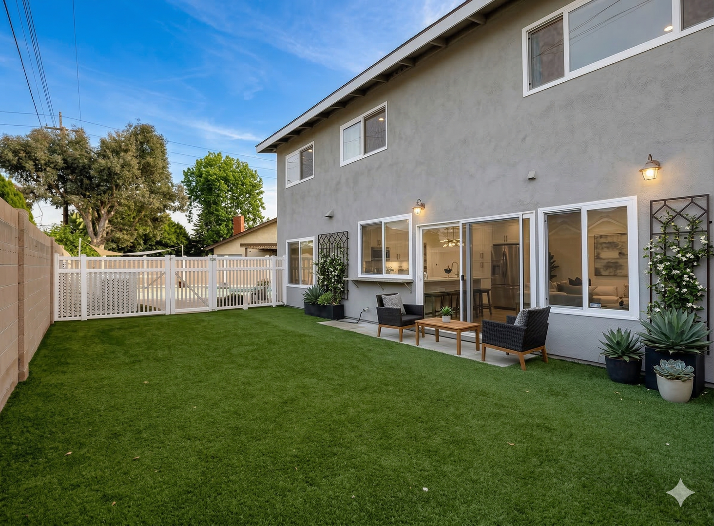 French doors from the family room lead to a spacious backyard designed for relaxation and entertaining. The yard features low-maintenance artificial turf and a gated pool area.